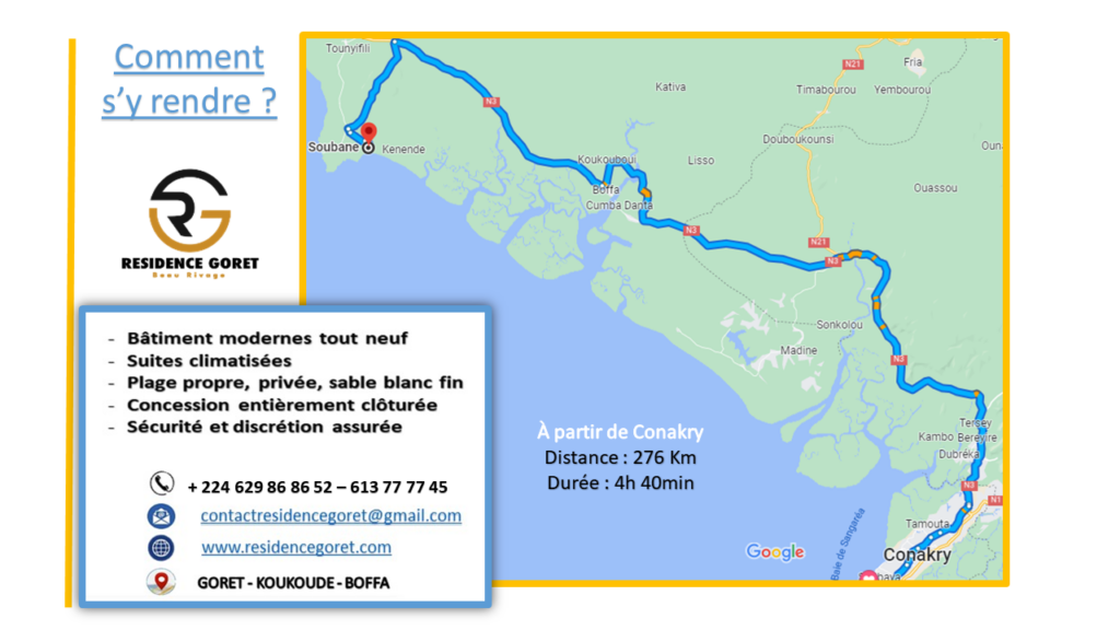 Pour s’y rendre, emprunter la route nationale N°3 pour aller à Kamsar, tourner à gauche du carrefour Bel Air (au niveau de la station essence) continuer tout droit jusqu’au carrefour Bel Air/Khoundindé, tourner à gauche au niveau de la mosquée du carrefour et continuer tout droit, vous traverserez deux barrières « Stop », ensuite vous suivrez le panneau « Goret Beach lodge » jusqu’à la résidence.