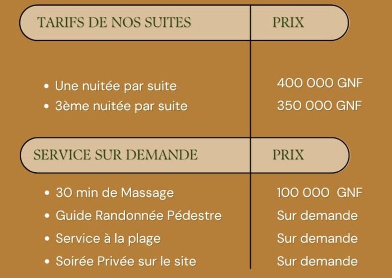 - Dès la 3ème Nuitée : Un tarif préférentiel de 350 000 GNF pour savourer davantage chaque instant.